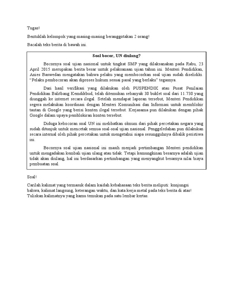 Contoh teks berita tentang pendidikan *soal bocor, un diulang???* bocornya soal ujian nasional untuk tingkat smp yang dilaksanakan pada rabu . Diduga kebocoran soal un ini melibatkan oknum dari pihak percetakan negara yang sudah ditunjuk. Dari berita tahun 2014 yang saya baca1,. Kepsek ini kebetulan salah satu reviewer. Tersiar kabar mengenai kebocoran soal ujian sekolah berstandar nasional (usbn).